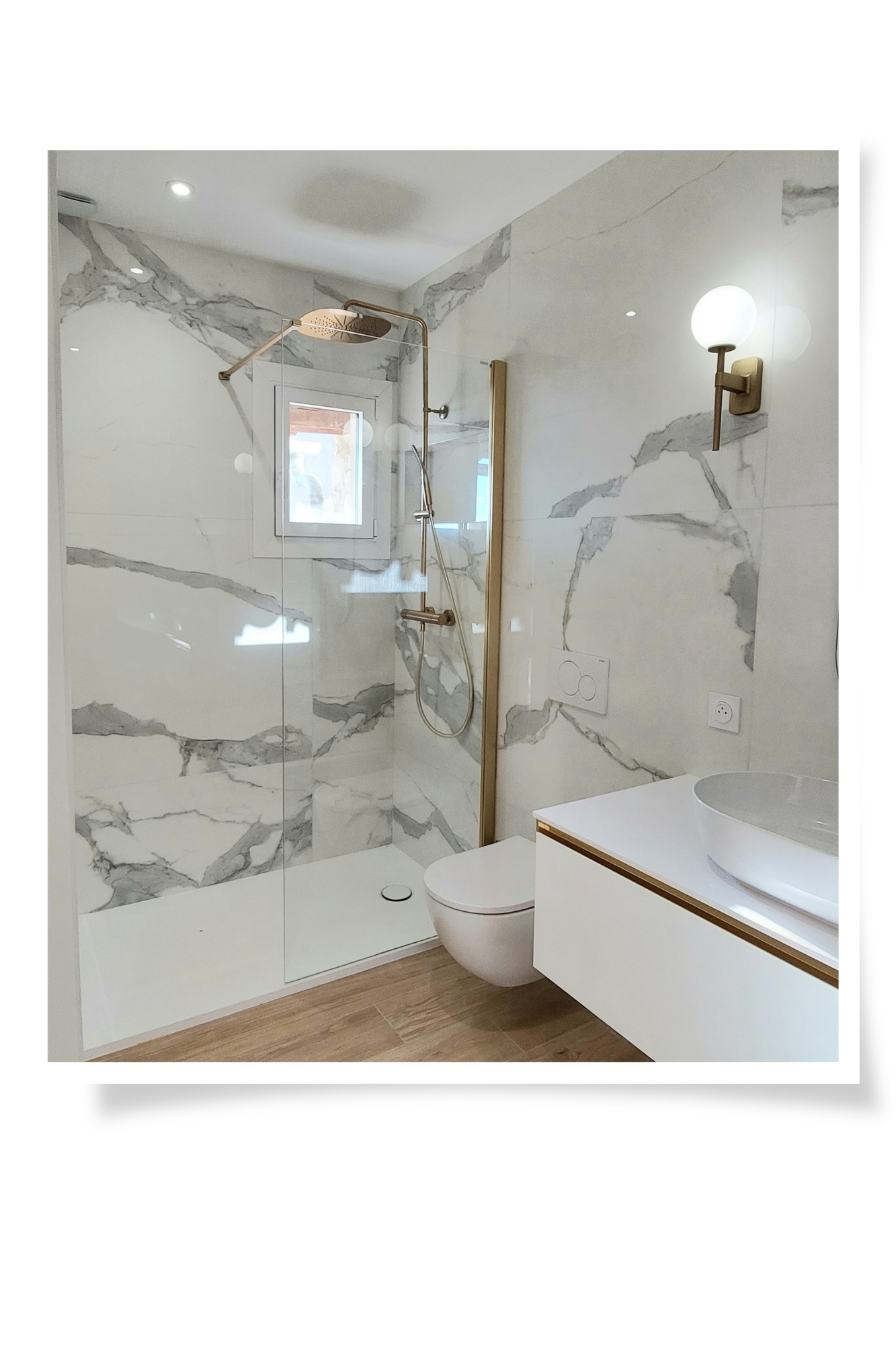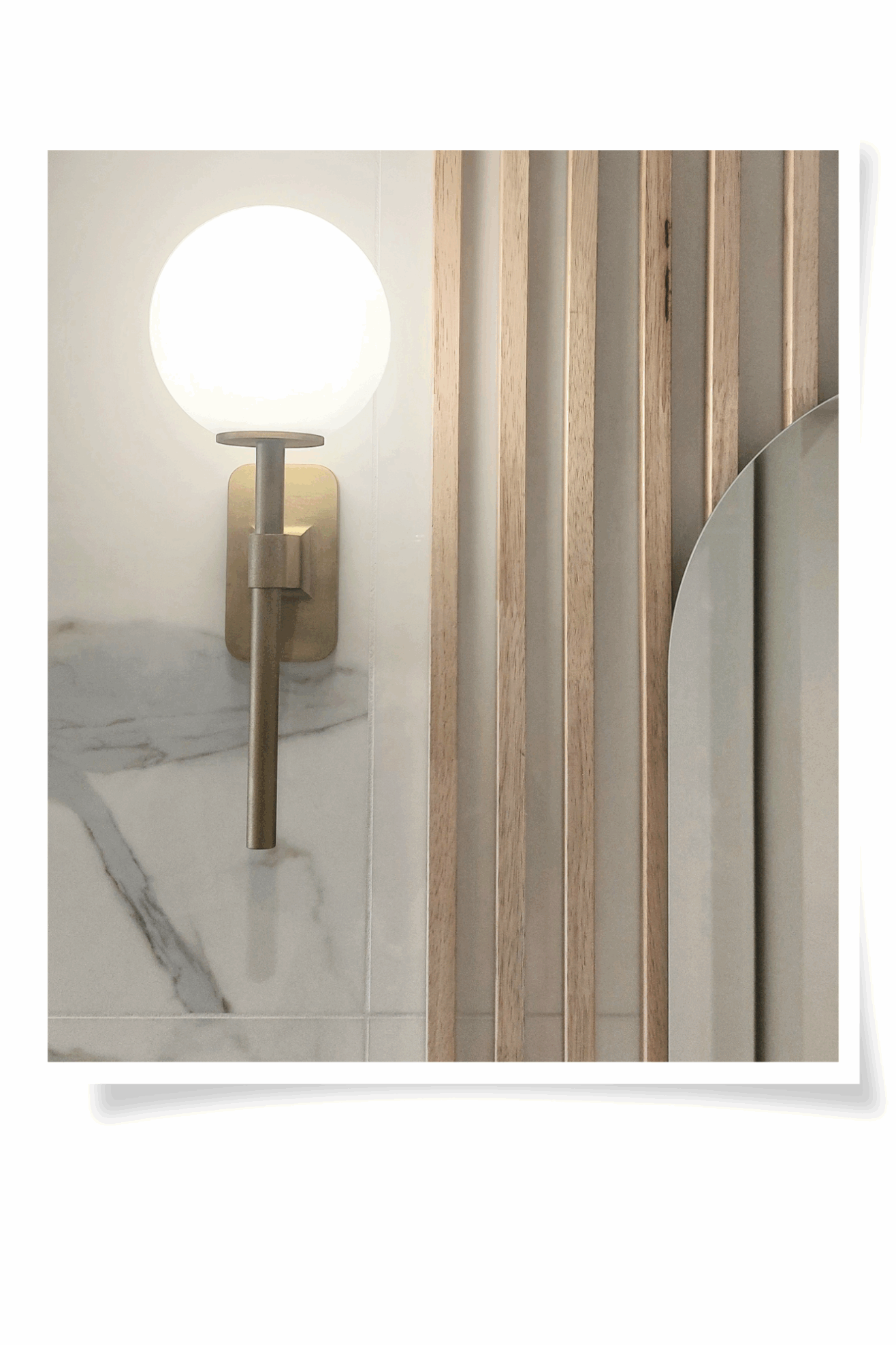 Ici, nous vous présentons donc la salle de bain où chaque détail a été minutieusement repensé: de l’implantation optimisée permettant de créer un espace confortable malgré la petite superficie, à l’harmonie des matériaux mêlant marbre, laiton et bois.